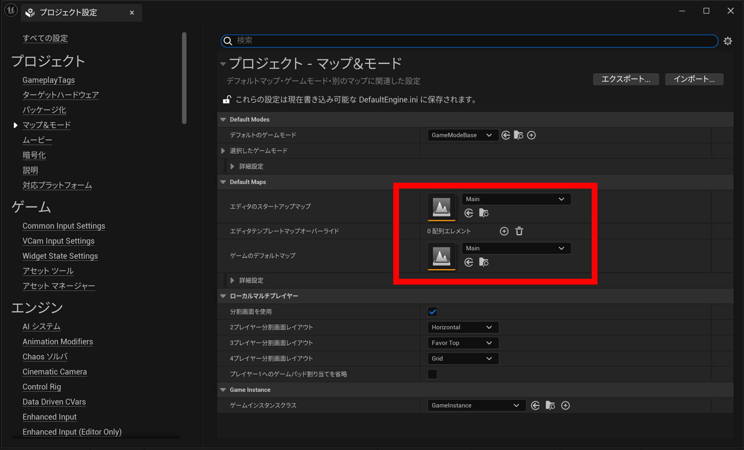 プロジェクトのマップ&モードにて、Mainをスタートマップとデフォルトマップに設定します。