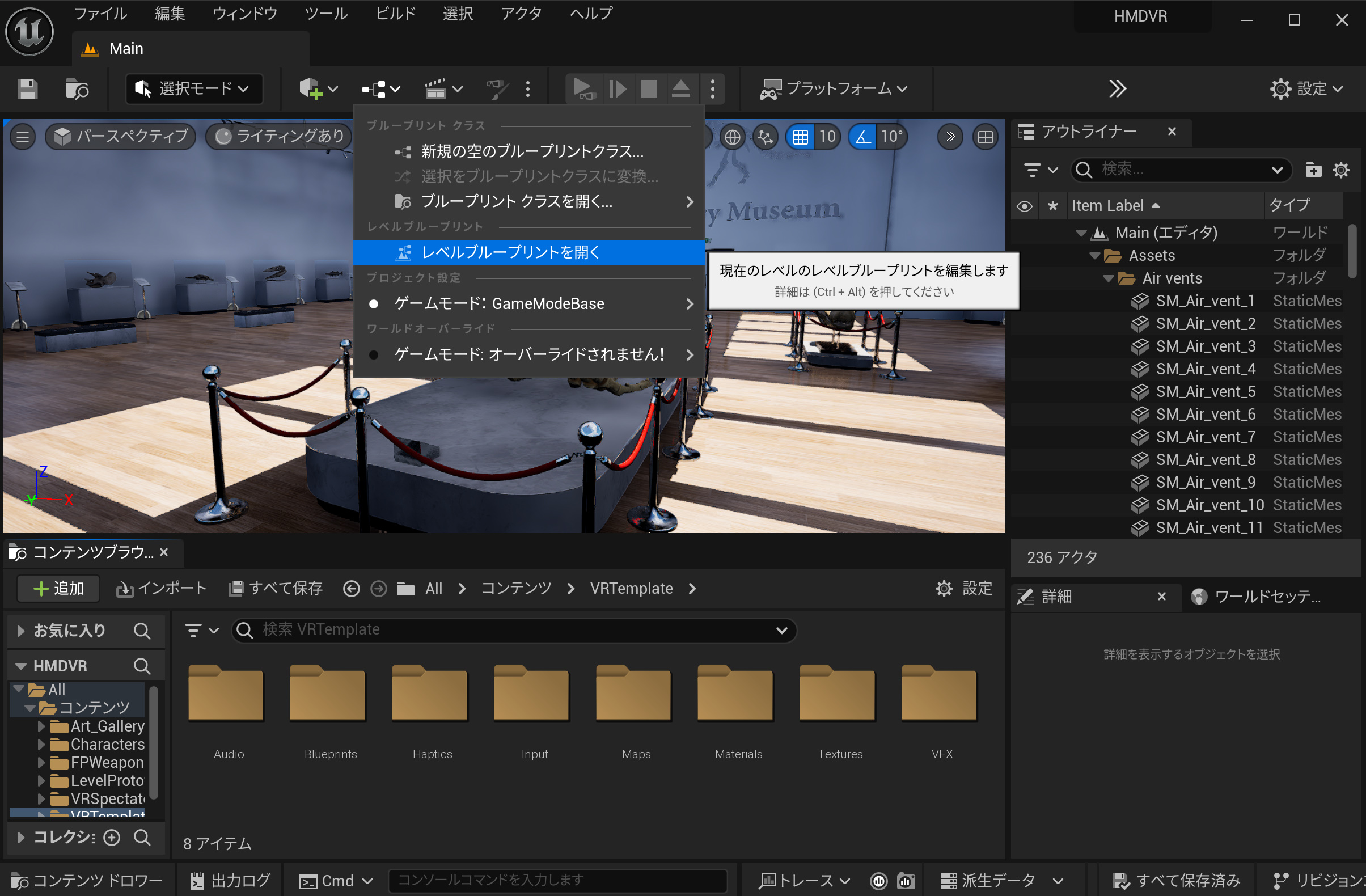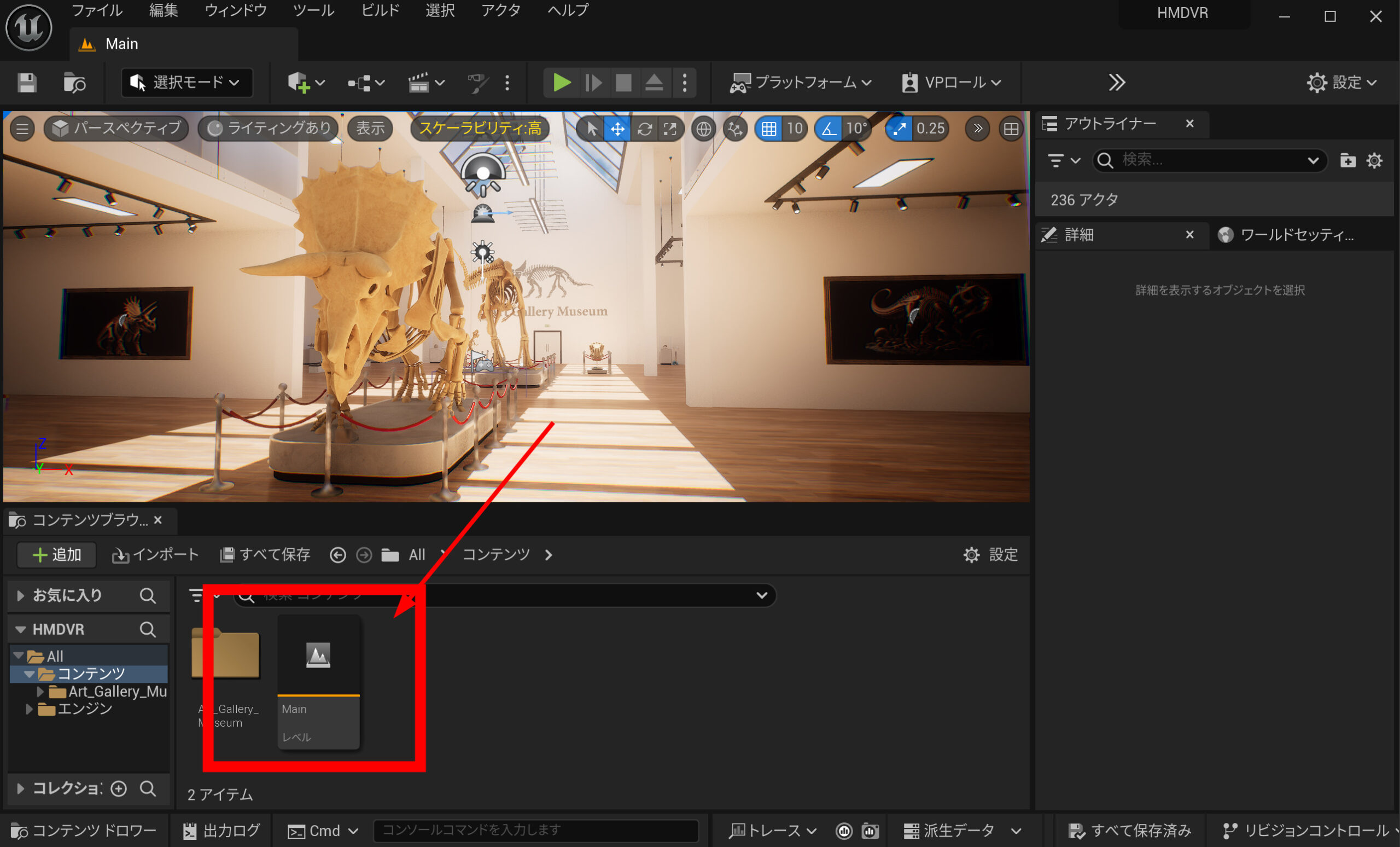 説明は省略しますが、取り込んだアセットをMainコンテンツに上書きします。Art Gallery Museumのデモから起動するようにしました。