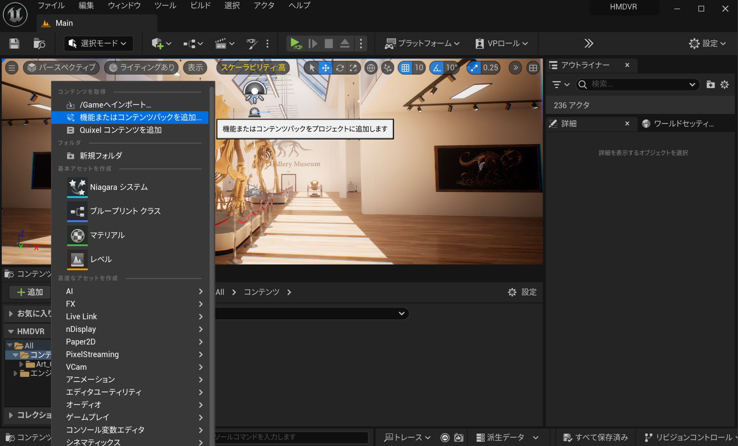 さてVRへの対応を準備します。ワンクリックでセットアップできます。コンテンツ追加をクリックして**「機能またはコンテンツパックを追加」**を選択します。