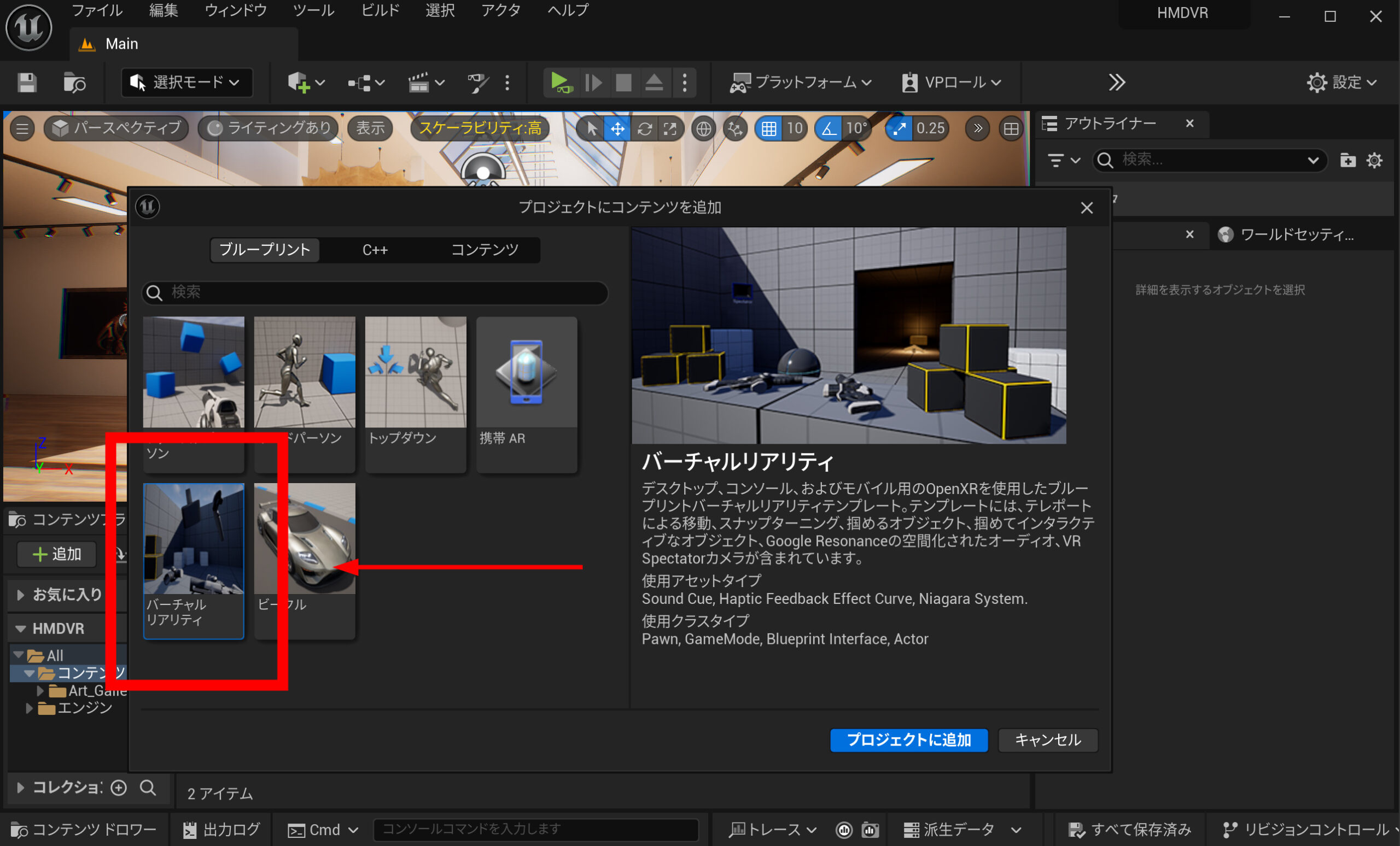 バーチャルリアリティをプロジェクトに追加します。