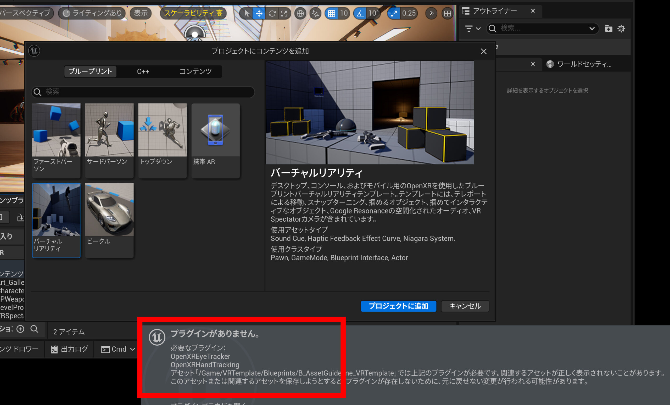 VRに必要なプラグインが自動で入ります。簡単ですね。隠れていますが右下にOKボタンがありますので、それらを押してください。UE5の環境準備完了です。