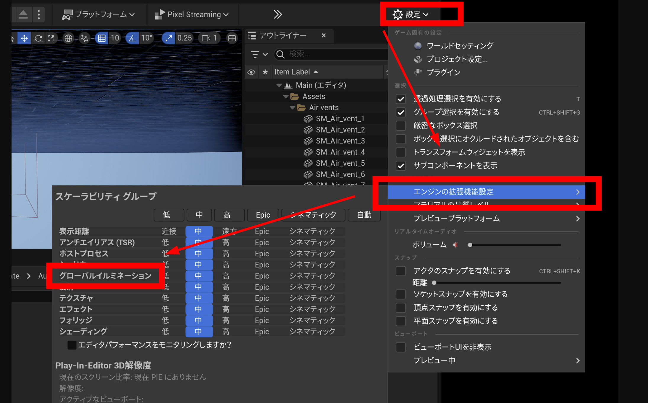 エンジンの拡張機能設定を変更して、VRプレビューを試してみてください。いろいろ試してみると、グローバルイルミネーションの負荷が一番大きく、ここを中以下にするとカクカクが解消されて、すんなり動きました。グローバルイルミネーションは、Lumenが大きく関連しています。中以下はLumenをオフにする設定です。