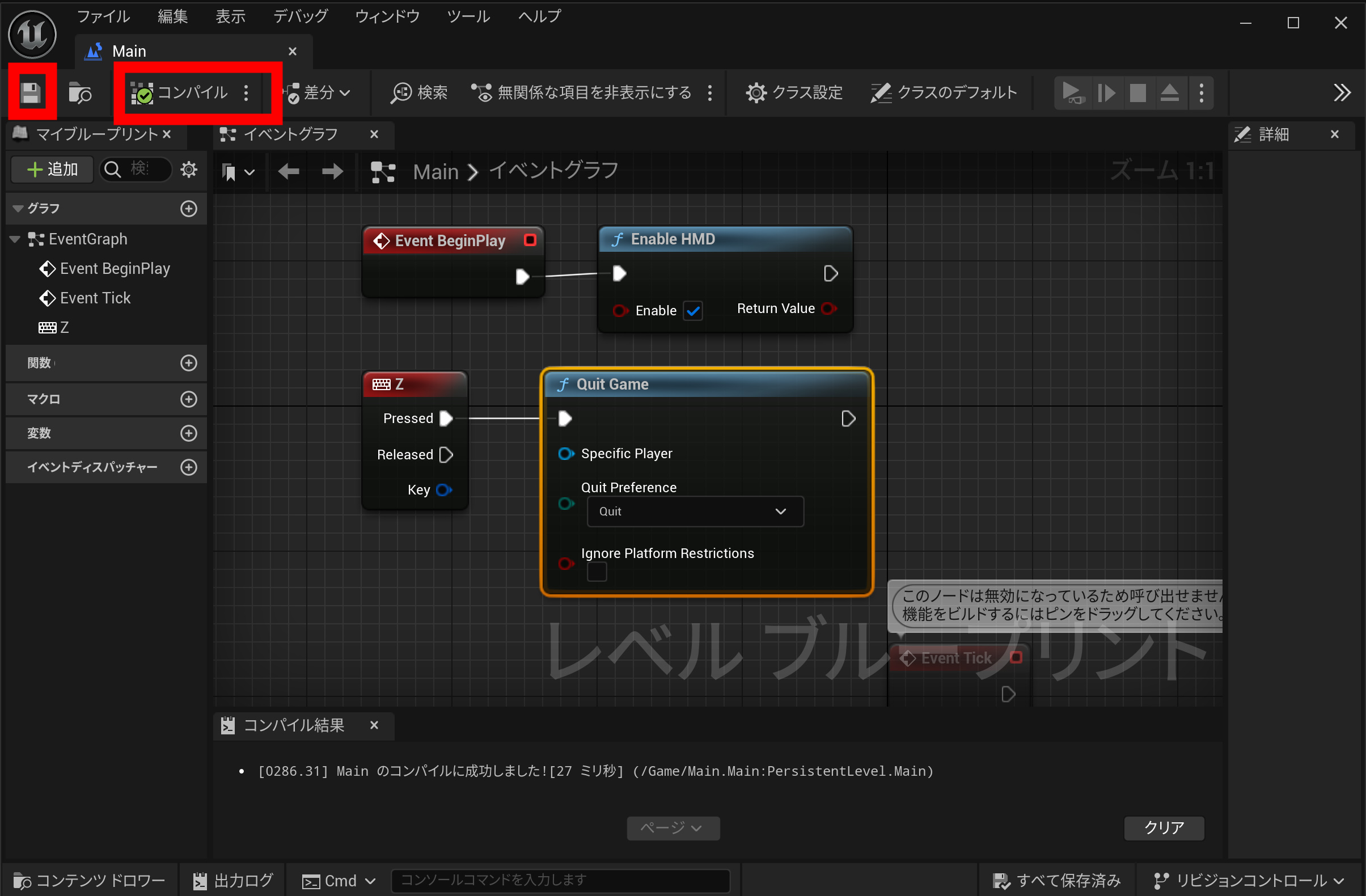 次はパッケージ化したあとにHMDが動作するようにブループリントを作ります。初期設定のままでは、VRプレビューは動作してもパッケージ化で動作させた場合は、VR機能が起動しません。
