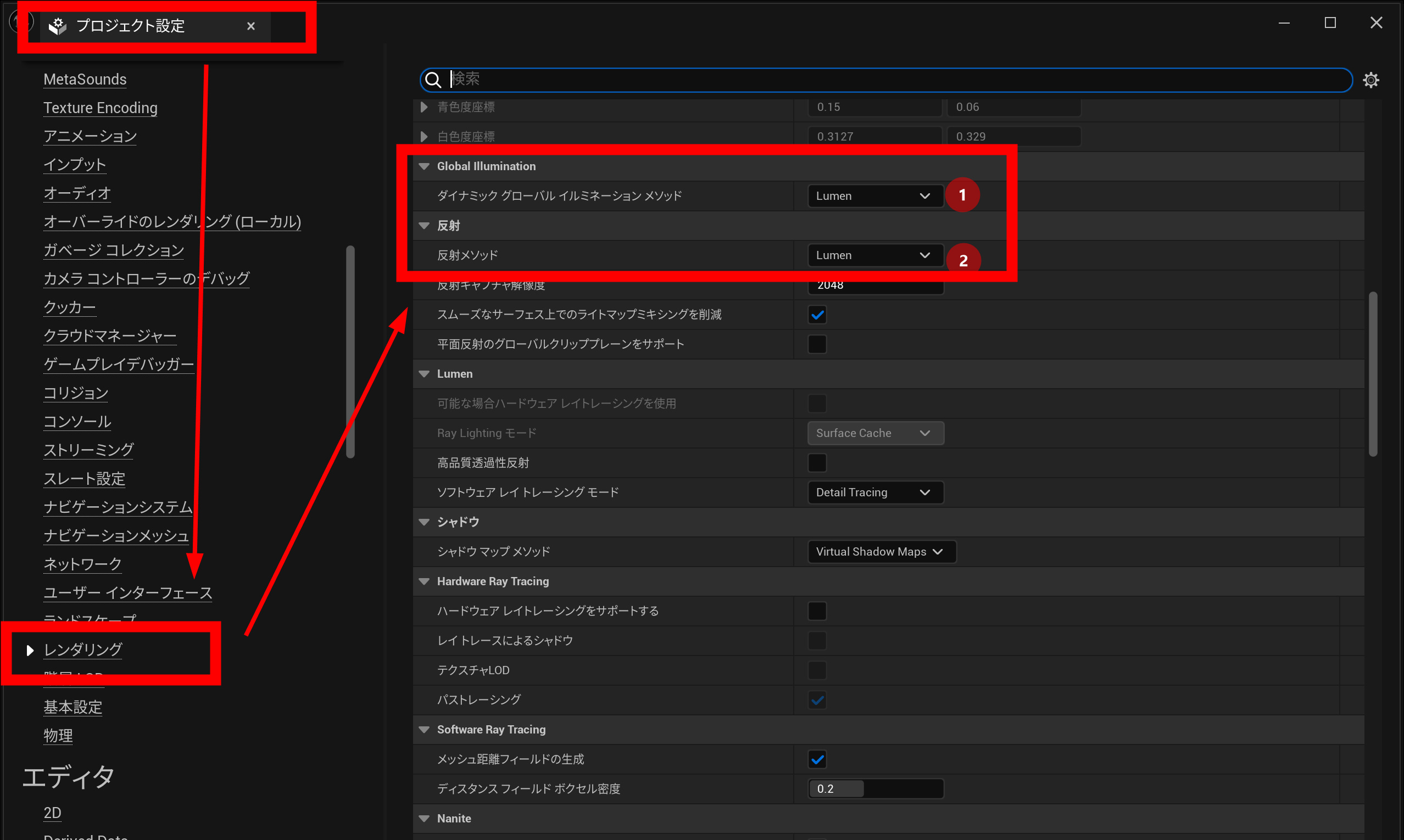 まずグローバルイルミネーションのLumenの影響が大きいので、Lumenの設定を切ります。プロジェクト設定→レンダリング→グローバルイルミネーションのダイナミックと反射メソッドをLumenからnoneに変更します。