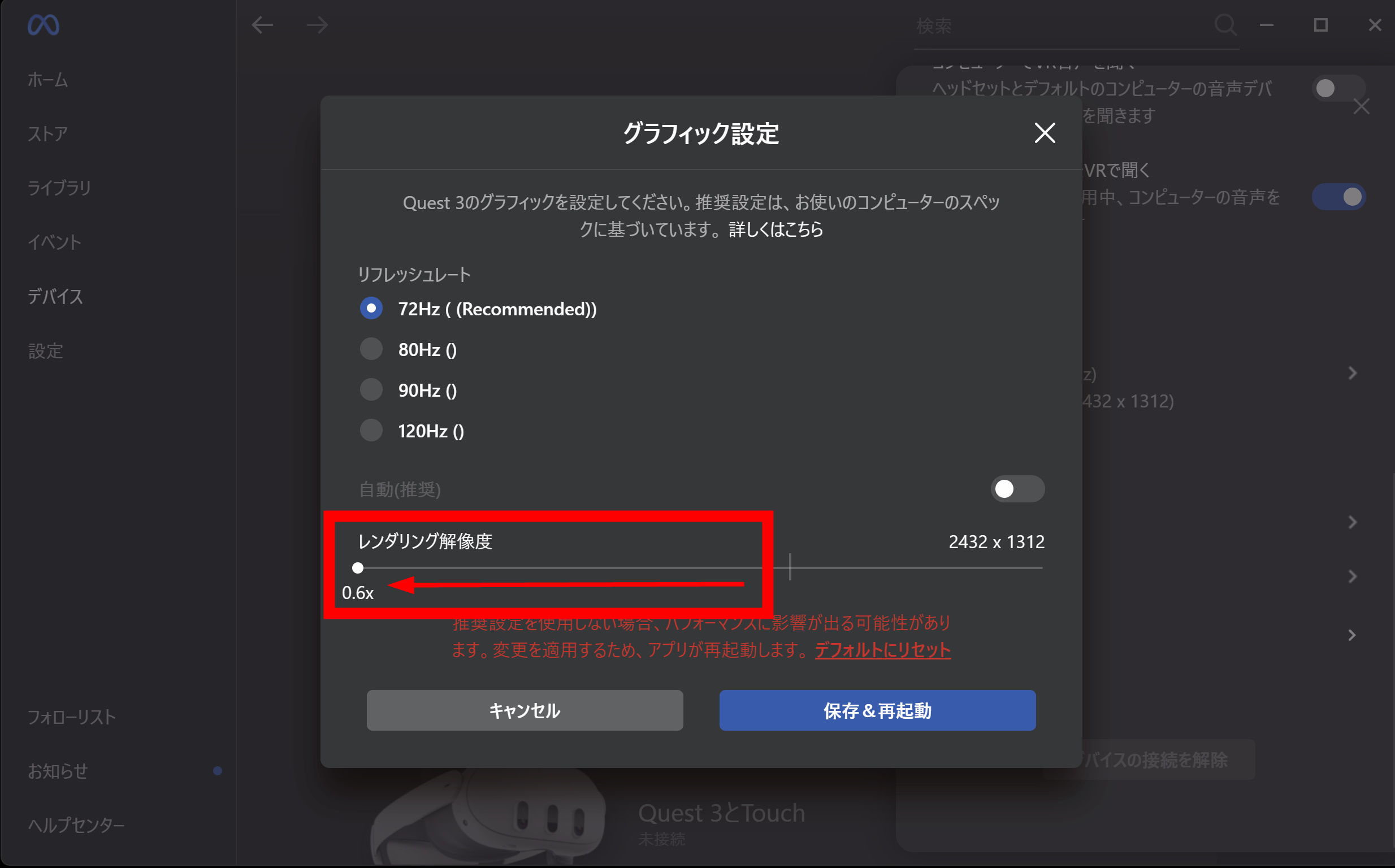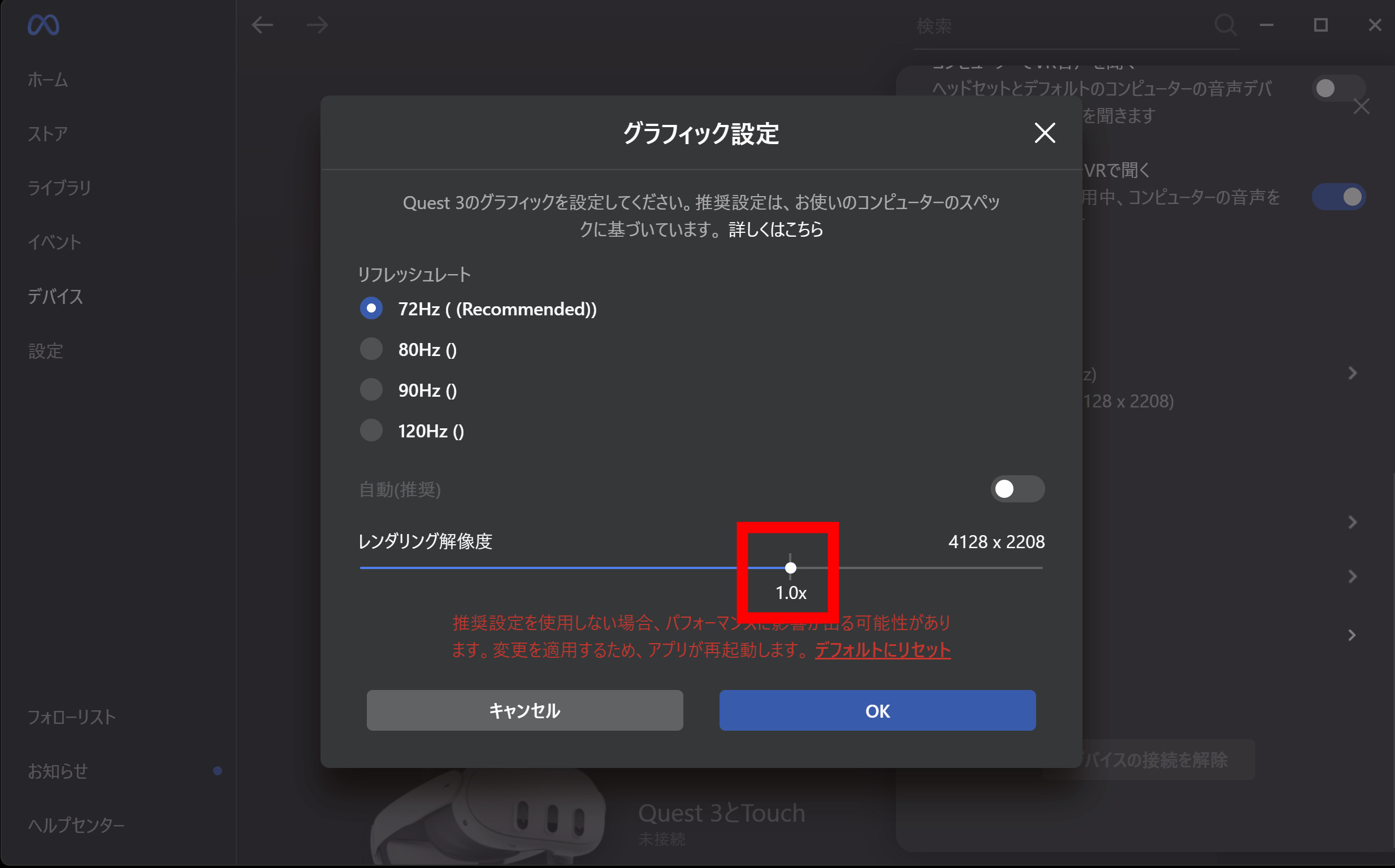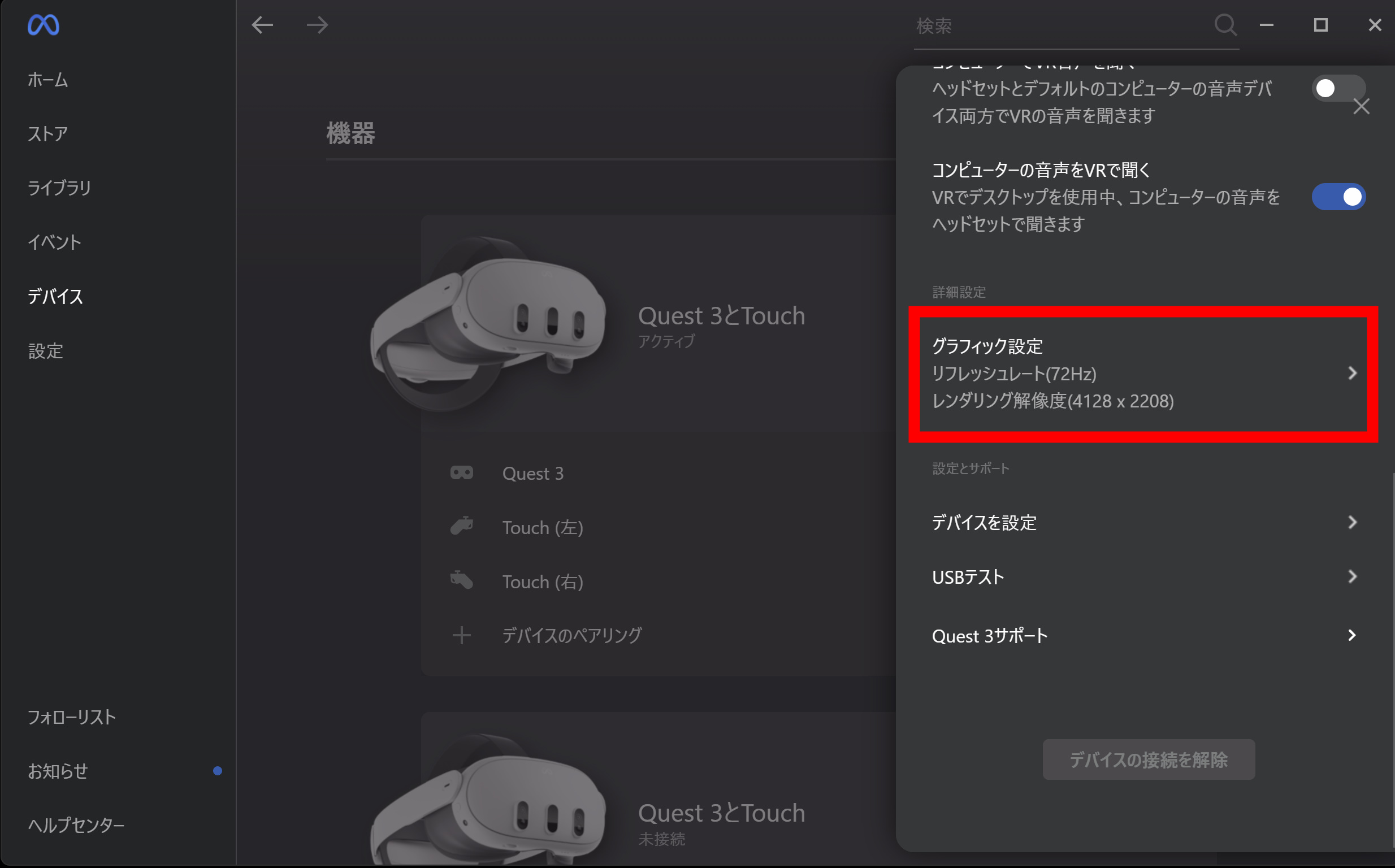meta quest3側に解像度を下げます。meta Quest linkアプリを開きます。デバイス設定から使っているQuest3を選択します。