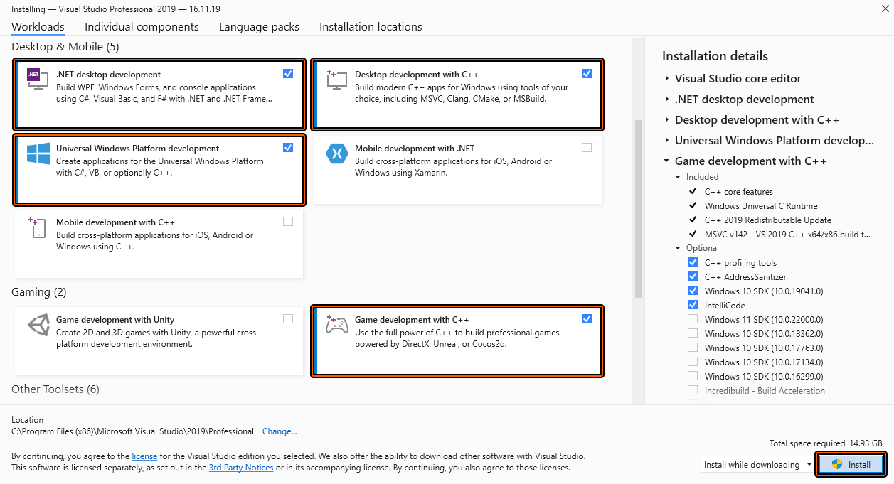 詳しくは先のサイト参照ですが、要は以下のチェック項目でVisual Studio 2022をインストールすればOKです。