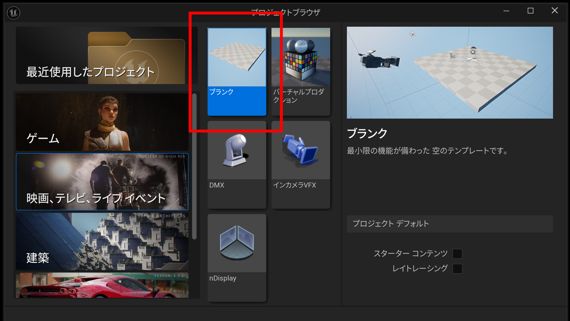 「映画、テレビ、ライブイベント」を選択します。あとはブランクでもなんでも良いです。今回はブランクを選択します。「映画、テレビ、ライブイベント」を選択すれば、すでにVCAMがセットアップされているわけです。