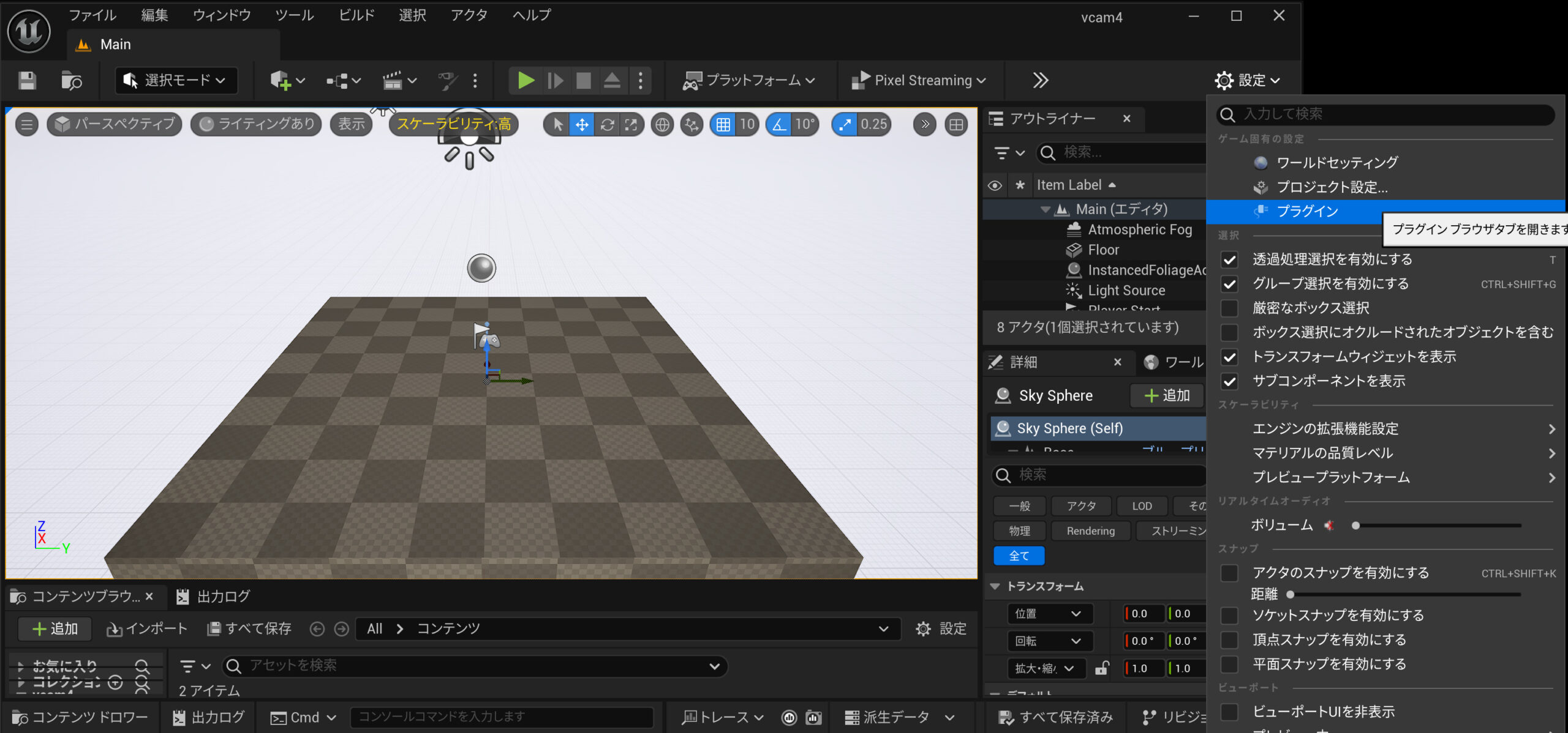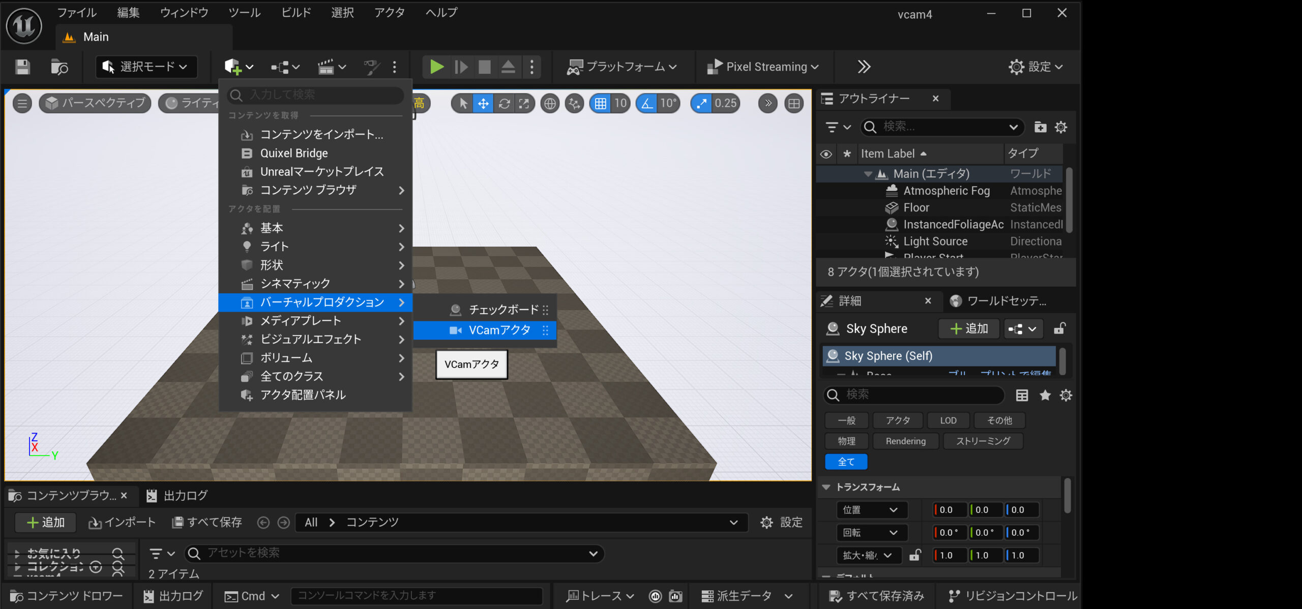 左上のメニューの「□+」をクリックして、「バーチャルプロダクション」を選択します。そのなかのVcamアクタを追加します。これで準備完成です。
