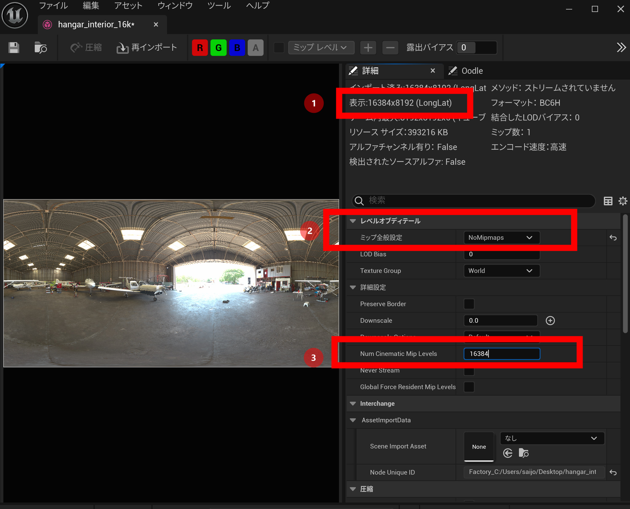 16384が最大の解像度であれば、ミップ全般設定をNoMipmapsに変更します。そしてしばらく待ちます。処理が終わったらNum Cinematic Mip Levels に16384と入力して保存します。