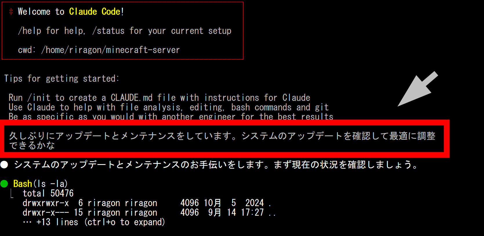 さてubuntu24.04にClaude Codeを入れました。claudeと入力すればスタートします。ターミナルから日本語で「システムをアップデートしてくれめんす」と入力しました。