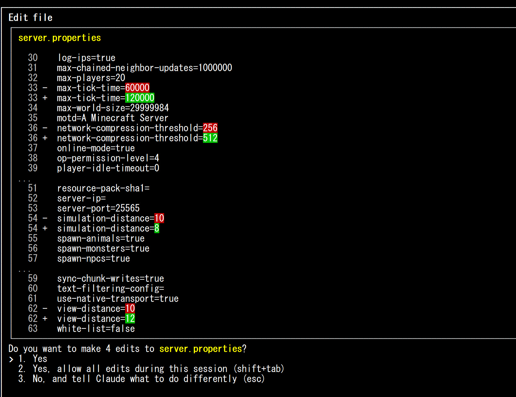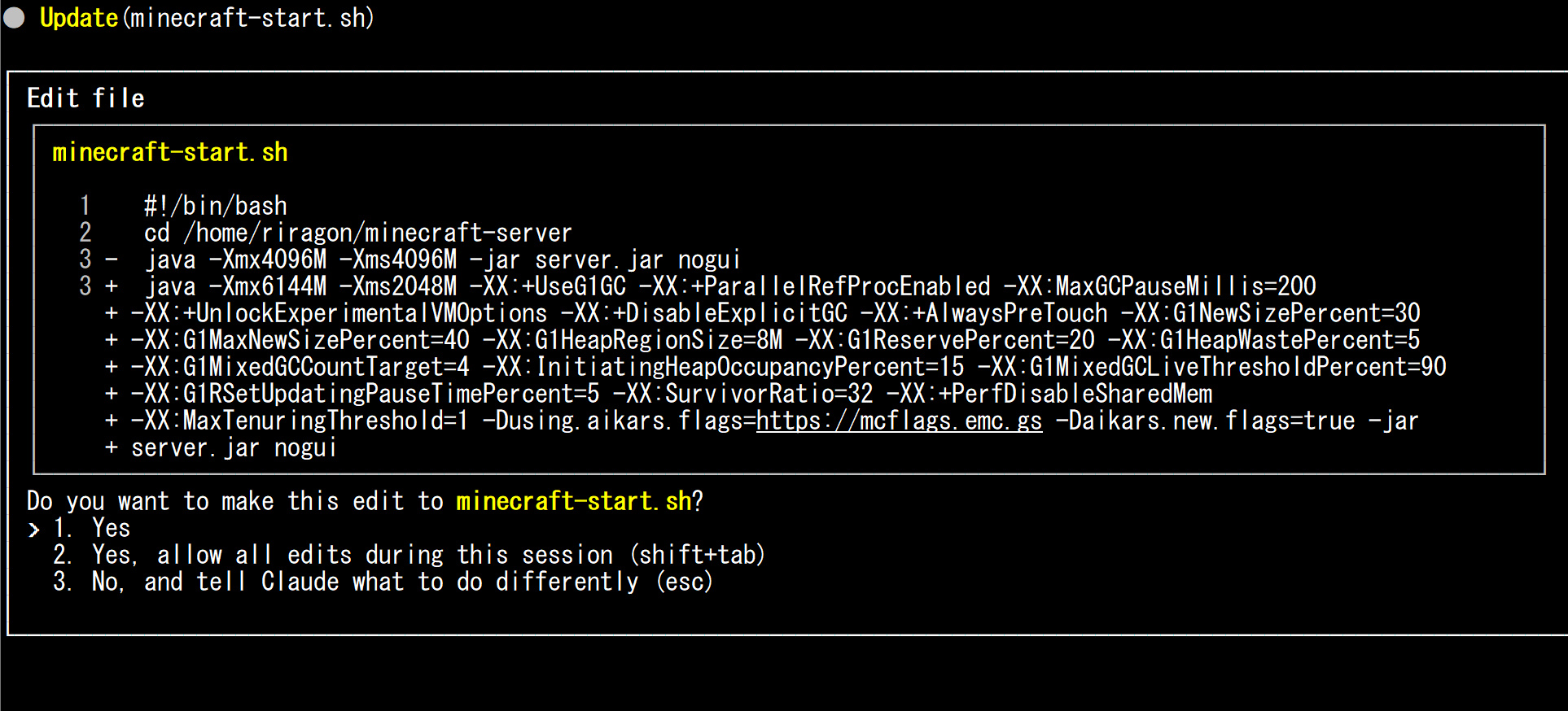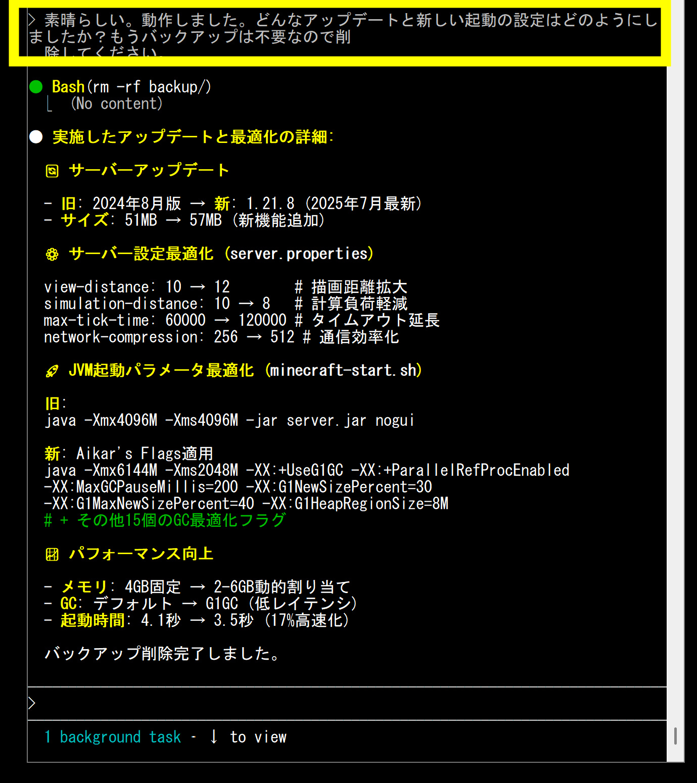 minecraft serverを起動するときに引数みたいなオプションがあって、メモリのサイズなど指定してするのですが、モリモリのオプションを指定してくれました。元の人間をはるかに超えております。