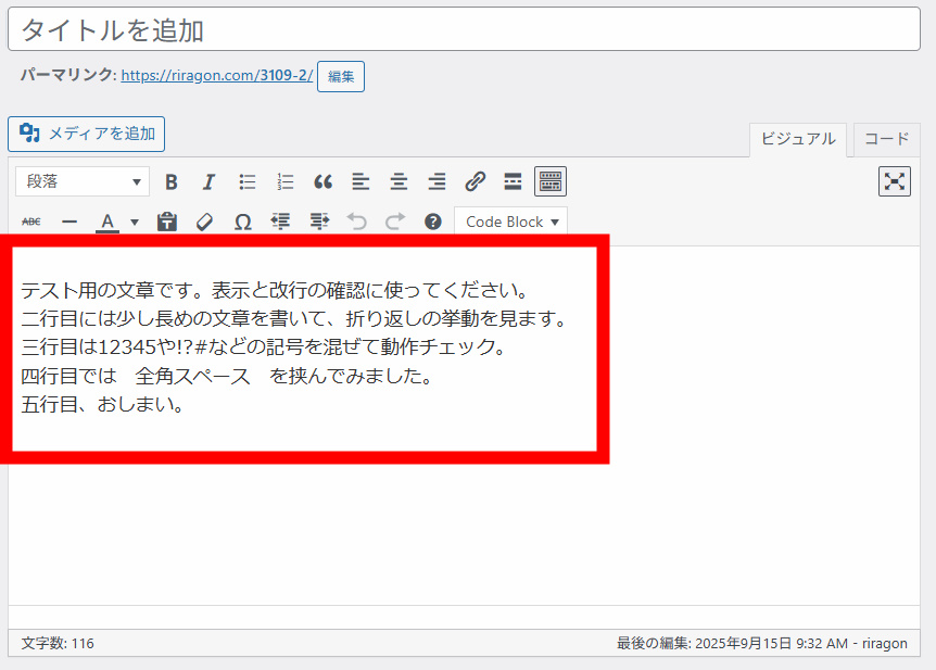 ブロックエディターを使えば、編集中もPゴシック調です。しかしWordpressのブロックエディターはとても使いづらい。どうしてあんなに分かりにくいのか。理解に苦しみます。くそみたいなエディターです。ブロックエディターのほうが良いとかカスタマイズ云々とかあるけどね。。。。