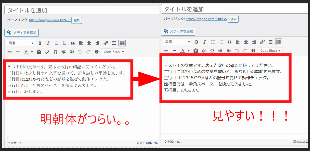 そこでプラグインを作って、クラシックエディター画面の明朝体を強制的にPゴシックにしました。これは快適です。最高です。